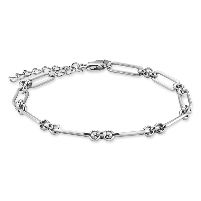 Kæden er udført i rustfrit stål, som er belagt med et blankt lag sølv. Armbåndet har skiftevis aflange led og tre små runde led. Variationen på længden af led, giver armbåndet et spændende look og spil.