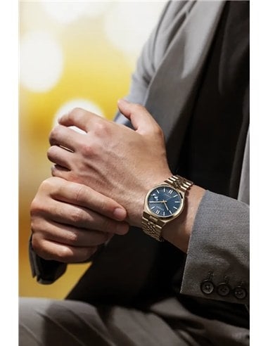 Den blå skive med delikate mønstre skinner i lyset og skaber en smuk kontrast til det varme roséguld. Skiven er let læselig takket være markører med luminescerende materiale. Armbåndet er poleret og børstet i kombination og følger håndleddet elegant.