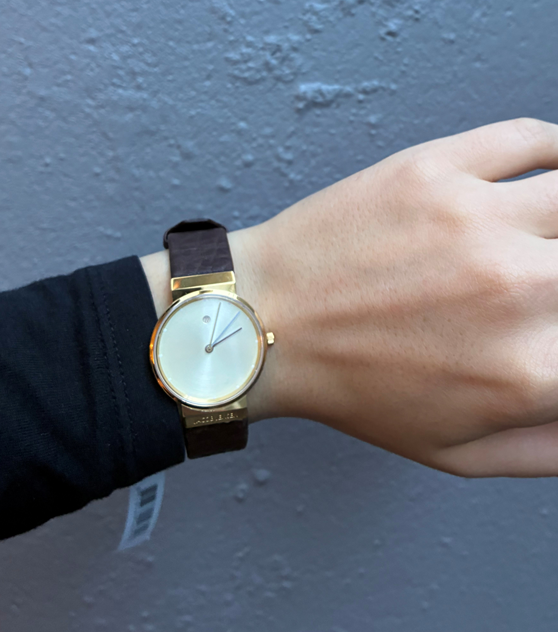 Uret er i forgyldt rustfrit stål med forgyldt skive og mørkebrun læderrem.
