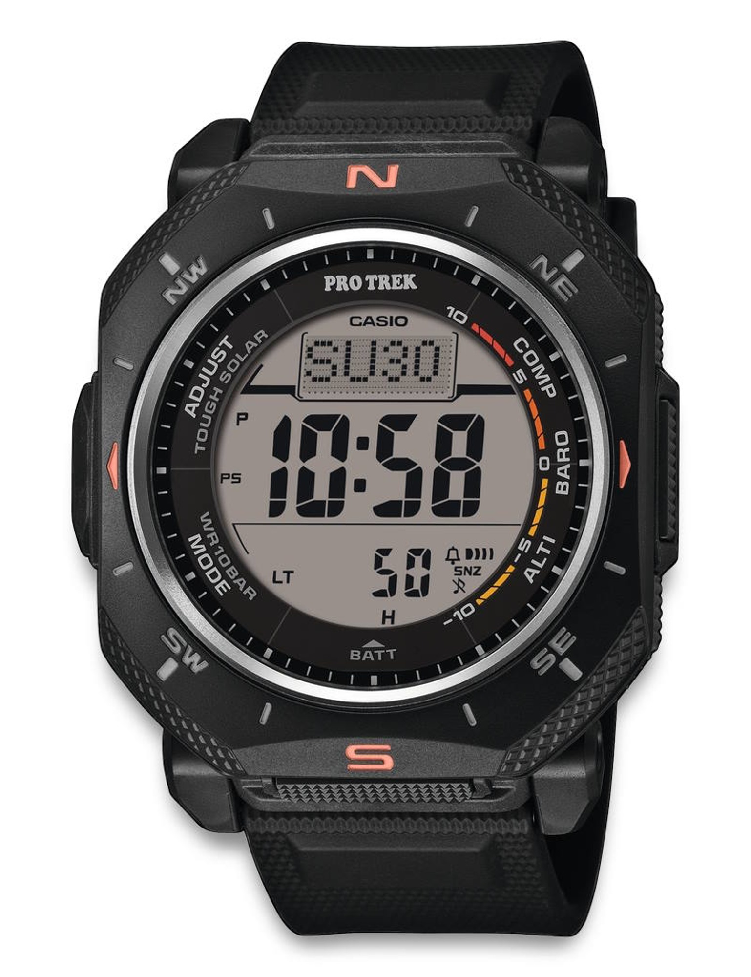 PRG-69-1ER er et avanceret outdoor-ur fra Casio, udviklet til at levere præcise målinger under alle forhold. Med Triple Sensor teknologi får du adgang til kompas, højdemåler og barometer direkte på håndleddet.